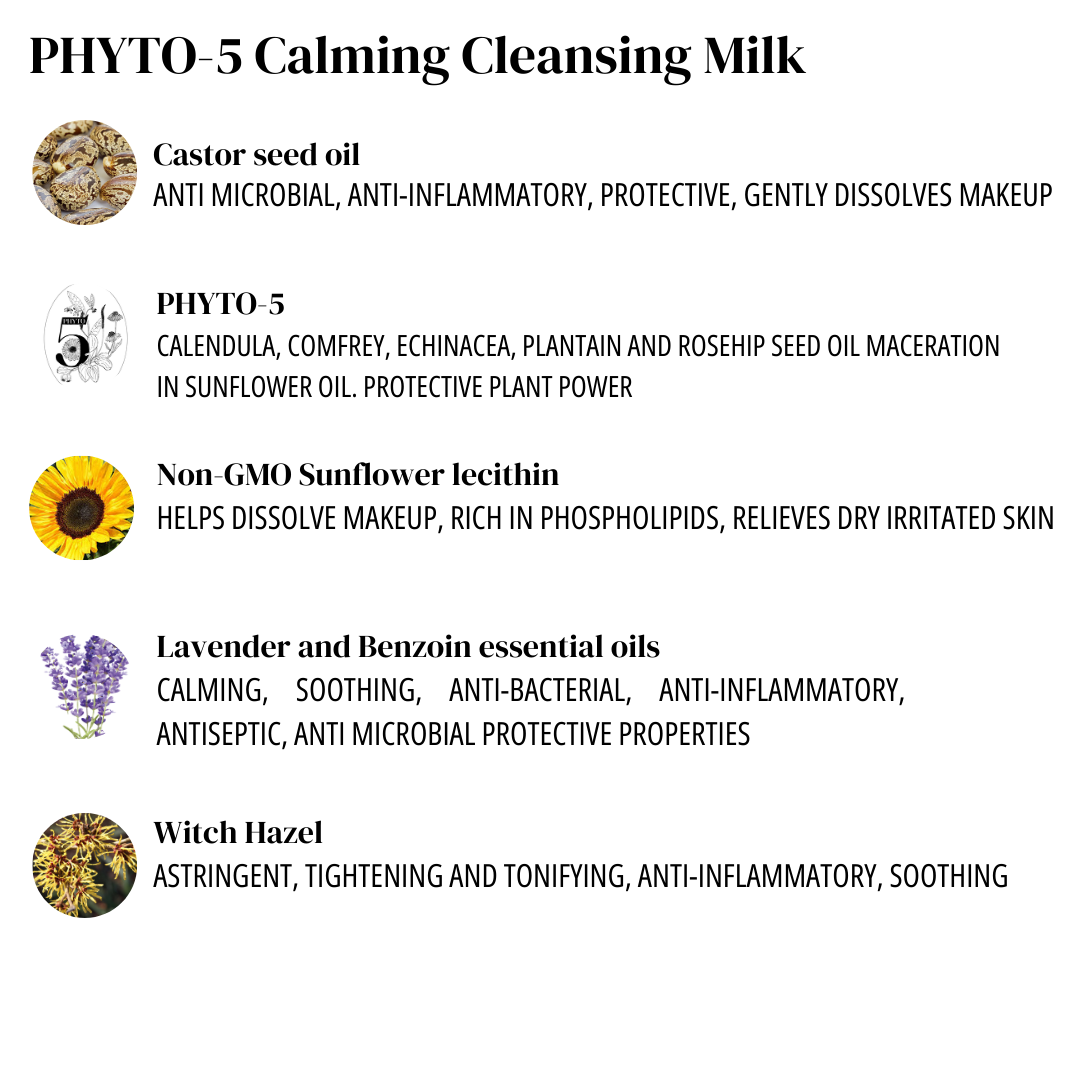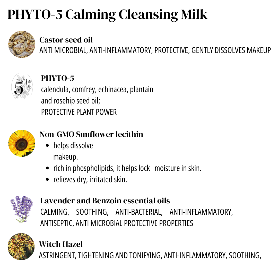Calm, cleanse, soften and comfort skin, while removing makeup with Kavana's PHYTO-5 Calming Cleansing Milk, so that skin never feels dry, stripped or 'pulling'. It's lightweight, cushiony texture is packed with the power of Phyto-5 complexe, a blend of five healing plants known for their collagen supporting, anti-inflammatory, anti-oxidant, moisturizing and soothing properties. Castor oil (Ricinus communis): The anti-oxidant and anti-microbial properties of castor oil in this milky cleanser, may help inhibit and fight topical, bacterial overgrowth . Ricinoleic acid in castor oil, may also exhibit anti-inflammatory properties which may help significantly reduce inflammation when applied to the skin. Naturally moisturizing, it can be especially soothing and hydrating for sensitive and acne-prone skin. Sunflower seed oil (Helianthus Annus): Extremely high in Vitamin E, carotenoids (vitamin A precursors) and Vitamin D, as well as polyunsaturated fatty acids that can help the skin get rid of acne, and anti-oxidants that may help neutralize free-radicals and may help reduce premature signs of aging, this oil is perfect for aging gracefully. This oil has been known to exhibit a super-light texture that is non-pore clogging, and fast absorbing, which may help improve skin's moisture and moisture retention capacities, while potentially smoothing and softening skin instantly. Benzoin resin and lavender: These essential oils are known to help calm the nervous system and may help prevent infections (source 2). Phyto-5 complexe is a blend of extracts from five plants known to exhibit healing properties and that have been used for millennia to help with skin healing and protection. Wildcrafted in Ontario, Canada*, these plants benefit the skin most by acting in concert, which may help reduce trans-epidermal water loss, boost collagen, potentially calm inflammation and deeply nourish the skin. *except rosehip seed oil from Chile.