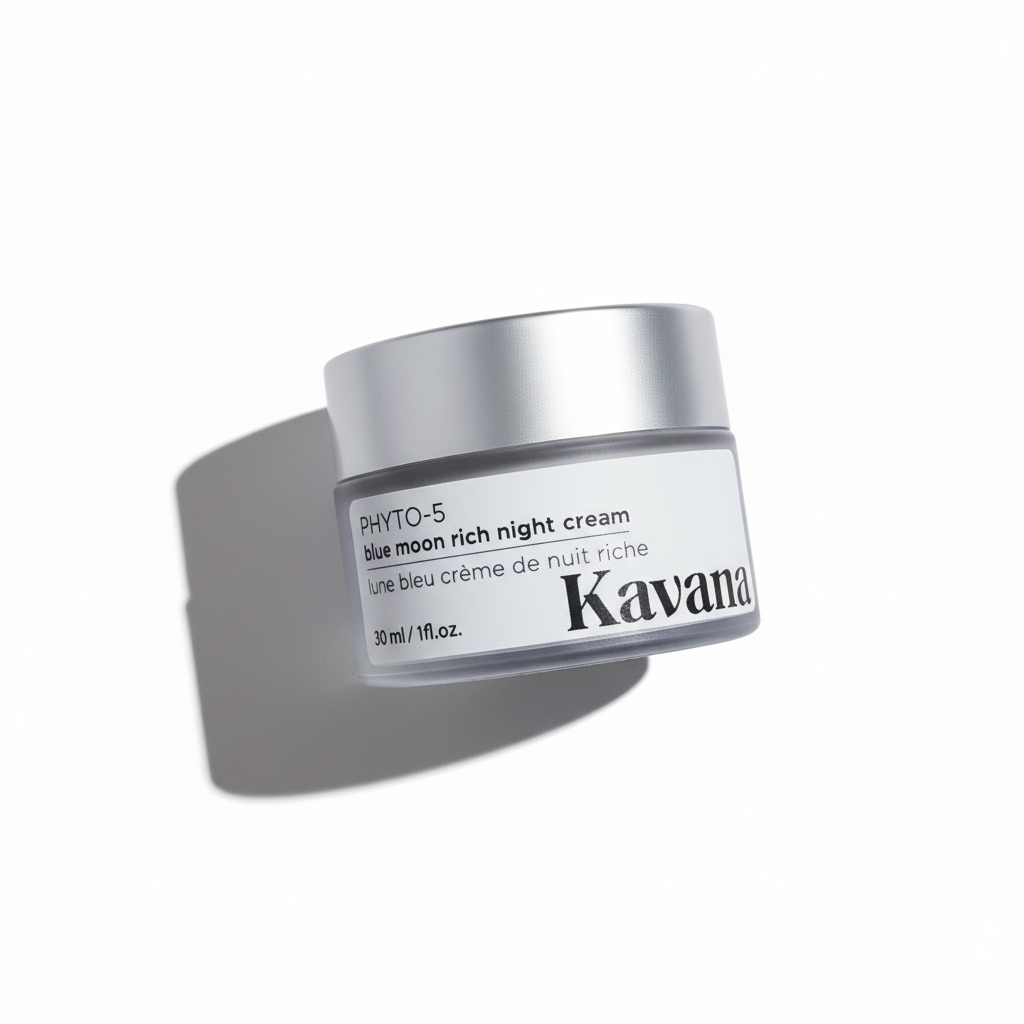 The moon phases above correlate to the Menstrual phase (waxing crescent moon) of a woman's monthly cycle and Perimenopause and Menopause phases (new moon / blackmoon). Kavana's ultra-nourishing Phyto-5 Blue Moon Rich Cream was formulated with women's changing hormones and skin in mind. When estrogens are at their lowest levels of the month and plunging in perimenopause and menopause, skin is at it's driest. Reach for the Blue Moon, with Kavana!