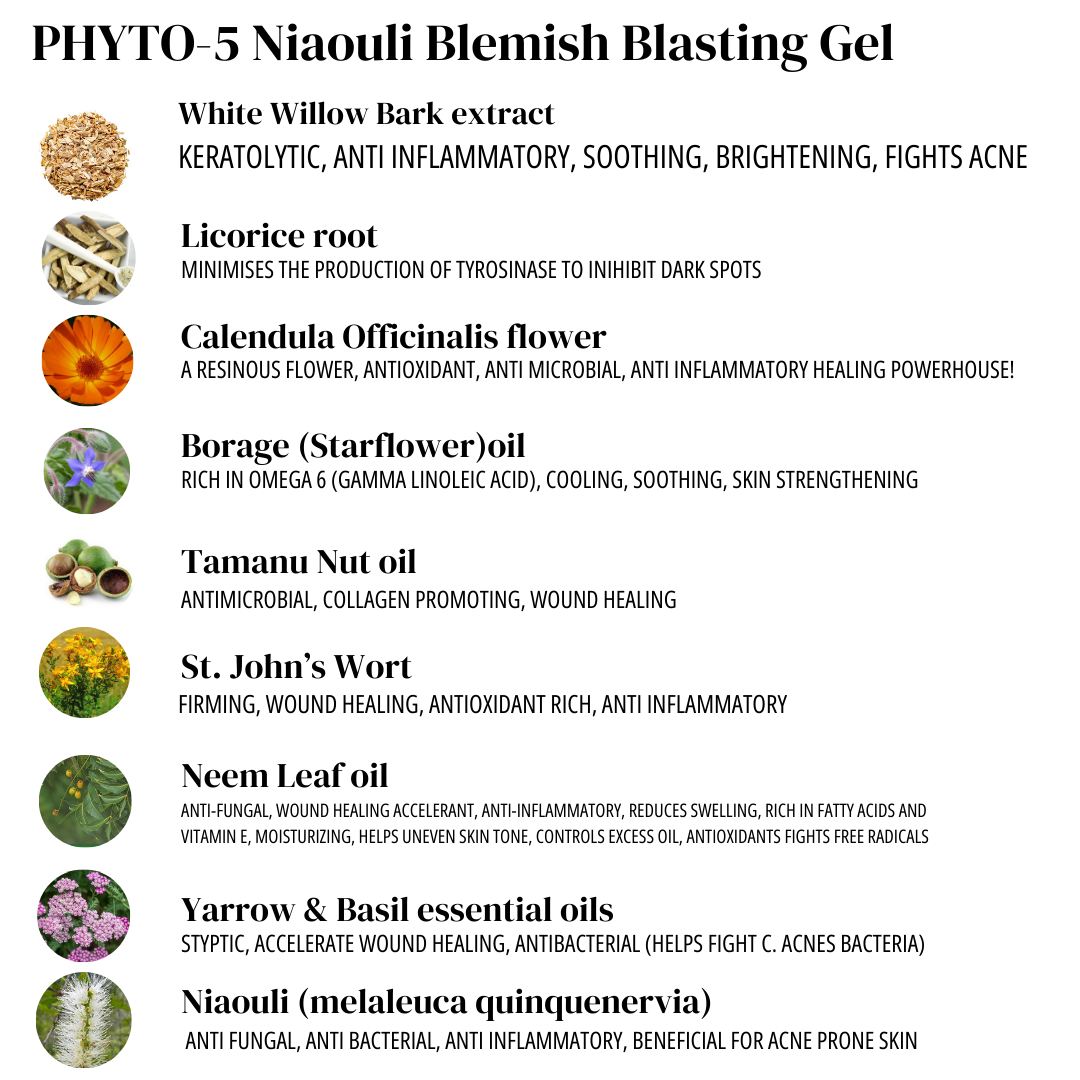 Kavana's premium botanical blend for adult acne in perimenopause is formulated with intention, and plant powered ingredients that help quell acne bacteria and heal wounds and scarring. It includes: WHITE WILLOW BARK- a natural source of salicin (salicylic acid) helps fight c. acnes bacteria LICORICE ROOT: minimizes the production of tyrosinase to inhibit dark spots CALENDULA officinalis flower- a resinous flower, it's antioxidant rich, anti inflammatory and anti-microbial, a healing powerhouse! BORAGE (starflower) oil- rich in Omega 6 (Gamma linoleic acid), it helps soothe and strengthen skin. TAMANU nut oil; contains antimicrobial properties, promotes collagen production and wound healing. ST. JOHN'S WORT macerated in Sunflower oil; very potent anti bacterial, it can help destroy acne bacteria on the skin and powerful scar healing capablities. YARROW (Achillea millefolium) a super-powerful styptich (helps staunch bleeding), it contains tannins, terpenes, flavonoids, alkaloids, linoleic acids,sterols, phenolic acids that are anti-inflammatory and healing. BASIL, a powerful anti bacterial, astringent and anti inflammatory essential oil that can help clear acne. NEEM (azadirachta neem): an anti-fungal that can help kill cutibacterium acnes, it's rich in Vitamin E, Vitamin C and essential fatty acids that help skin heal. NIAOULI (Melaleuca quinquenervia) along with a blend of eight different essential oils found in all of Kavana's Niaouli products, that have anti-fungal, anti bacterial and anti-inflammatory properties, are beneficial for acne prone skin.