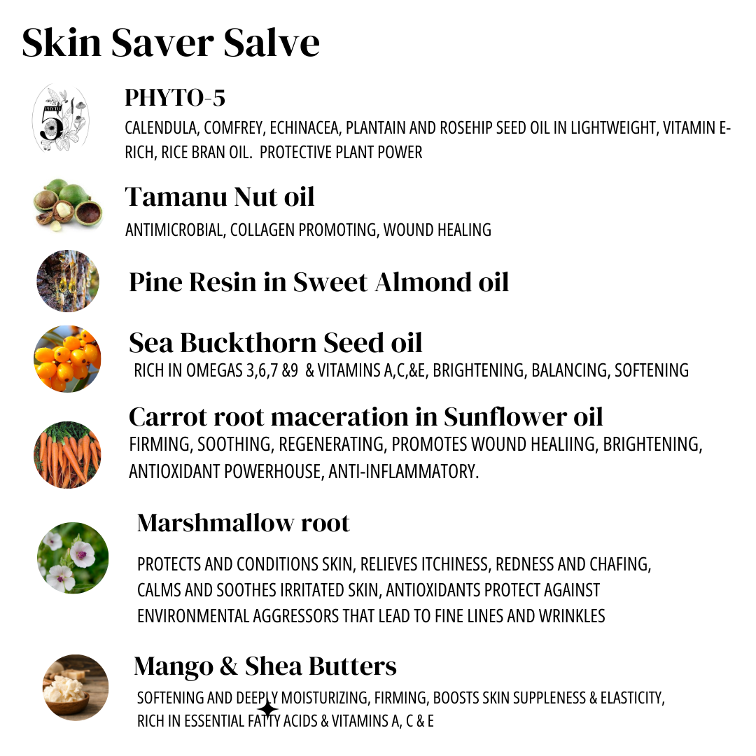 Skin Saver Salve Ingredients: Theobroma Cacao butter, Botyrospermum Parkii (Shea) butter, Cera alba* (Beeswax), Cetyl Alcohol (vegan wax), PHYTO-5 (Calendula, Comfrey, Echinacea Purpurea, Plantain & Marshmallow oil macerated in Sunflower oil) Daucus carota (Carrot root) macerated in Sunflower oil, Pine resin macerated in Sweet Almond seed oil, Sea Buckthorn (Hippophae rhamnoides) seed oil, Tamanu (Callophyllum inophyllum) nut oil, Tocopherols (Vitamin E), Tangerine essential oil.